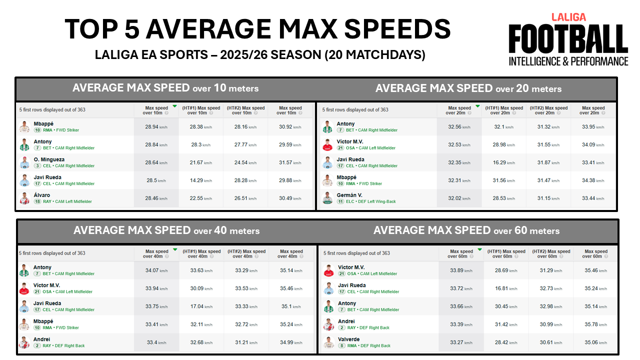 By showing average maximum speeds across different distances using current-season examples (LALIGA EA Sports 2025/26, first 20 matchdays), it highlights an applied reality:
